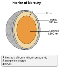 Mercury's high density can be used to infer details of its inner structure. While the Earth's high density results partly from compression at the core, Mercury is much smaller and its inner regions are not nearly so compressed. Therefore, for it to have such a high density, its core must be large and rich in iron.[1] Geologists estimate that Mercury's core occupies about 42 percent of its volume (by comparison, Earth's core occupies about 17 percent of its volume). Surrounding the core is a 600-kilometer mantle.