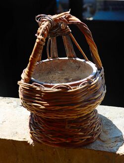 After the earthen pots are moulded and fired, the artisans complete the wickerwork around them,[8] by erecting two arms to handle the pot, propping the back side with strong wicker sticks, and colour it (optionally) to give an aesthetically delicate shape.[9] The final product then goes to the market.