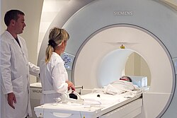 Nuclear magnetic resonance (NMR) is the phenomenon by which some atomic nuclei, when placed in a magnetic field, can absorb radio waves of certain frequencies. It has chemical applications in the form of NMR spectroscopy and medical applications in the form of the Nuclear Magnetic Resonance Imaging machine, a.k.a. the MRI.[1][2]
