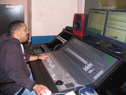 Each channel on a mixer has a volume control (fader) that allows adjustment of the level of that channel. These are usually sliders near the front of the mixing board, although some smaller mixers use rotary controls to save space. The signals are summed to create the main mix, or combined on a bus as a submix, a group of channels that are then added as a whole to the final mix. For instance, many drum mics could be grouped into a bus, and then the proportion of drums in the final mix can be controlled with one bus fader.[3] A bus can often be processed just like an individual input channel, allowing the engineer to process a whole group of signals at once. Once again using the drum kit example, the use of bus-processing can enable the sound engineer to run all of the drum kit through an audio compressor effect to reduce unwanted signal peaks, rather than having to route all of the 10 or more mic signals on the drum kit individually. There may also be insert points for a certain bus or even the entire mix.
