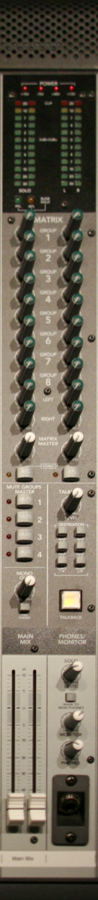 Subgroup and main output fader controls are often found together on the right-hand side of the mixer or, on larger consoles, in a center section flanked by banks of input channels. Matrix routing is often contained in this master section, as are headphone and local loudspeaker monitoring controls. Talkback controls allow conversation with the artist through their monitors, headphones or in-ear monitor. A test tone generator might be located in the master output section. Aux returns such as those signals returning from external processors are often in the master section.