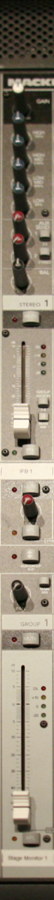 The channel input strips are usually a bank of identical monaural or stereo input channels arranged in columns. Typically, each channel's column contains a number of rotary potentiometer knobs, buttons, and faders for controlling the gain of the input preamplifier, adjusting the equalization of the signal on each channel, controlling routing of the input signal to other functional sections, and adjusting the channel's contribution to the overall mix being produced.
