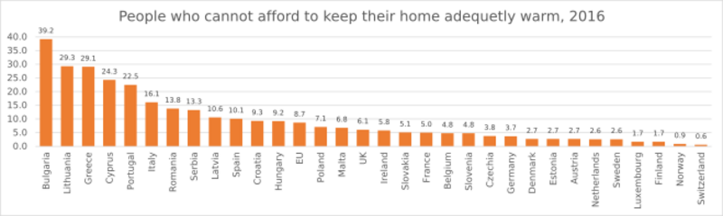Nine percent of the EU population could not afford to heat their home sufficiently with Bulgaria scoring the highest of 39.2%.[6]