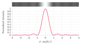 | [math]\displaystyle{ I(\theta)\, }[/math] | [math]\displaystyle{ = I_0 {\left[ \operatorname{sinc} \left( \frac{\pi a}{\lambda} \sin \theta \right) \right] }^2 }[/math] |