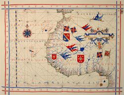 The first use of color in map-making cannot be narrowed down to one reason. There are arguments that color started as a way to indicate information on the map, with aesthetics coming second. There are also arguments that color was first used on maps for aesthetics but then evolved into conveying information.[31] Either way, many maps of the Renaissance left the publisher without being colored, a practice that continued all the way into the 1800s. However, most publishers accepted orders from their patrons to have their maps or atlases colored if they wished. Because all coloring was done by hand, the patron could request simple, cheap color, or more expensive, elaborate color, even going so far as silver or gold gilding. The simplest coloring was merely outlines, such as of borders and along rivers. Wash color meant painting regions with inks or watercolors. Limning meant adding silver and gold leaf to the map to illuminate lettering, heraldic arms, or other decorative elements.