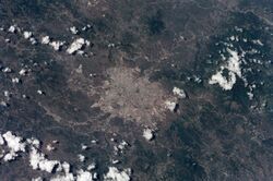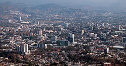 Tegucigalpa is located in the southern-central highland region known as the department of Francisco Morazán of which it is also the departmental capital.[19] It is situated in a valley, surrounded by mountains. Tegucigalpa and Comayagua, being sister cities, are physically separated by the Choluteca River.[20] The Central District is the largest of the 28 municipalities in the Francisco Morazán department.[21]