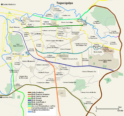 All barrios and colonias in Tegucigalpa can be accessed by automobile, although some neighborhoods in the city suffer from unpaved, narrow, or hilly streets making them difficult to maneuver.[159] A grid of surface streets and a network of major avenues and boulevards cross through the major areas of the capital. However, the most transited roads suffer from heavy traffic congestion due to the region's geography and disorganized urbanization.