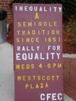 LGBTQ activism at FSU is unusual in that it was actually a fight against the school itself. The Pride Student Union (PSU), originally LGBSU, was founded in 1969 to represent LGBTQ students.[52][53] In 1980 a gay male named William Wade won the title of Homecoming Princess under the pseudonym "Billy Dahling" causing controversy.[54][55][56] In 2006 the Union Board added sexual orientation to its nondiscrimination policy causing several student organizations to be zero-funded for noncompliance. Christian Legal Society had the student senate reverse the freezing after threatening a lawsuit[57][58] which resulted in the founding of The Coalition for an Equitable Community (CFEC) to advocate for an inclusive nondiscrimination policy.[59][60] In 2008 CFEC filed suit with the FSU Student Supreme Court against the Union Board for failing to uphold the policy though they ruled they lacked jurisdiction after hearing the case.[61] In November 2009 CFEC placed an editorial in the FSView to provide perspective on the issue.[62] In June 2010 the University Board of Trustees passed a resolution protecting students based on sexual orientation, gender identity and gender expression.[63]