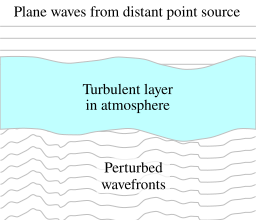 A description of the nature of the wavefront perturbations introduced by the atmosphere is provided by the Kolmogorov model developed by Tatarski,[2] based partly on the studies of turbulence by the Russian mathematician Andrey Kolmogorov.[3][4] This model is supported by a variety of experimental measurements[5] and is widely used in simulations of astronomical imaging. The model assumes that the wavefront perturbations are brought about by variations in the refractive index of the atmosphere. These refractive index variations lead directly to phase fluctuations described by [math]\displaystyle{ \phi_{a} \left(\mathbf{r}\right) }[/math], but any amplitude fluctuations are only brought about as a second-order effect while the perturbed wavefronts propagate from the perturbing atmospheric layer to the telescope. For all reasonable models of the Earth's atmosphere at optical and infrared wavelengths the instantaneous imaging performance is dominated by the phase fluctuations [math]\displaystyle{ \phi_{a} \left(\mathbf{r}\right) }[/math]. The amplitude fluctuations described by [math]\displaystyle{ \chi_{a} \left(\mathbf{r}\right) }[/math] have negligible effect on the structure of the images seen in the focus of a large telescope.