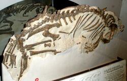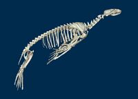 Enaliarctos, a fossil species of late Oligocene/early Miocene (24–22 mya) California , closely resembled modern pinnipeds; it was adapted to an aquatic life with flippers and a flexible spine. Its teeth were more like land predators in that they were more adapted for shearing. Its hind-flippers may have allowed it to walk on land, and it probably did not leave coastal areas as much as its modern relatives. Enaliarctos was likely more of a fore-flipper swimmer, but could probably swim with either pair.[13] One species, Enaliarctos emlongi, exhibited notable sexual dimorphism, suggesting that this physical characteristic may have been an important driver of pinniped evolution.[21] A closer relative of extant pinnipeds was Pteronarctos, which lived in Oregon 19–15 mya. As in modern seals, the maxilla or upper jaw bone of Pteroarctos intersects with the orbital wall. The extinct family Desmatophocidae lived 23–10 mya in the North Pacific. They had long skulls that with large orbits, interlocked zygomatic bones and rounded molars and premolars. They also were sexually dimorphic and may have been capable of swimming with both or either pair of flippers.[13] They are grouped with mordern pinnipeds, but there is debate as to whether they are more closely related to phocids or to otariids and walruses.[22][4]