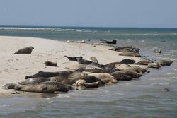 As a whole, pinnipeds can be found in a variety of aquatic habitats, mostly coastal water, but also open ocean, deep waters near offshore islands, brackish waters and even freshwater lakes and rivers. The Baikal seal is the only exclusively freshwater species.[85] Pinnipeds also use a number of terrestrial habitats and substrates, both continental and island. In non-polar regions, they haul out on to rocky shores, sandy and pebble beaches, sandbanks, tidal flats or pools, and in sea caves. Some species also rest on man-made structures built along the coast or offshore. Pinnipeds may move further from the water using sand dunes or vegetation, or even rocky cliffs.[86] New Zealand sea lions may travel to forests 2 kilometres (1.2 mi) from the ocean.[87] In polar regions, seals haul out on to both fast ice and drift ice. Some even den underneath the ice, particularly in pressure ridges and crevasses.[88]