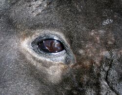 On land, pinnipeds are near-sighted in dim light. This is reduced in bright light as the retracted pupil decreases the ability of the lens and the cornea to refract (bend) light.[54] Polar living seals like the harp seal have corneas that are adapted to the bright light that reflects off snow and ice. As such, they do not suffer snow blindness.[55][54] Pinnipeds appear to have limited color vision as they lack S-cones.[56] Flexible eye movement has been documented in seals.[57] The walrus can project its eyes out from its sockets in both a forward and upward direction due to its advanced extraocular muscles and absence of an orbital roof.[16] The seal eye is durable as the corneal epithelium is hardened by keratin, and the sclera is thick enough to withstand the pressures of diving. Seals also secrete mucus from the lacrimal gland to protect their eyes. As in many mammals and birds, pinnipeds possess nictitating membranes.[58]
