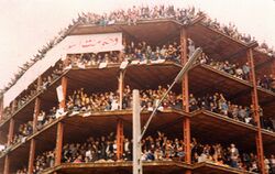Another mourning ritual is the dramatic reenactment of Karbala narratives (ta'ziya, shabih-khwani), practiced today in Iran, in the western Gulf shore, and in Lebanon.[56] On Ashura, always the "martyrdom of Husayn" is reenacted in such performances.[56] In Karbala, an annual performance on Ashura reenacts the burning of Husayn's tents after the battle by the Umayyads and the captivity of the women and children.[57] During Muharram, especially on Ashura,[47] processions of mourners (dasta, mawkib) march the streets,[58] chanting dirges and elegies,[59] sometimes accompanied by self-flagellation.[47][57] For instance, in the tawarij march in Karbala, male and then female mourners walk barefoot to the shrine of Husayn in the afternoon of Ashura.[57] Depending on the region, processions carry symbolic objects, such as alam (lit. flag),[60] nakhl (lit. date palm),[61] ta'ziya,[61] and tadjah.[62] Alam represents the ensign of Husayn in Karbala,[61] while the last three objects symbolize his bier or tomb.[61][63]