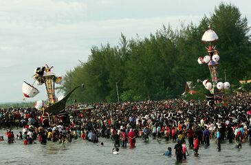 Submerging tabuiks on Ashura in a mock funeral of Husayn, Indonesia