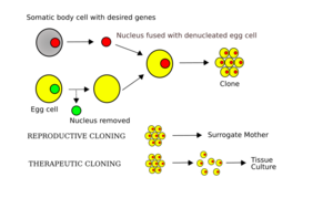 Transplantation of nuclei taken from somatic cells into an oocyte (egg cell) lacking its own nucleus (removed in lab)[2][3][4][5]