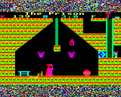 In addition to the crystals, various other items are located throughout the 100 different rooms[4] of the castle which can be collected and used to solve puzzles in order to obtain the crystals. These include coloured keys which open doors of the same colour, giving access to other areas of the game; an 'ice crystal' which, whilst carried, causes water in its vicinity to freeze, enabling access to previously inaccessible areas; trampolines which can be jumped on to reach high areas ordinarily out of reach, and many others.