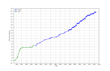 A supercomputer is a computer with a high level of performance as compared to a general-purpose computer. The performance of a supercomputer is commonly measured in floating-point operations per second (FLOPS) instead of million instructions per second (MIPS). Since 2017, supercomputers have existed which can perform over 1017 FLOPS (a hundred quadrillion FLOPS, 100 petaFLOPS or 100 PFLOPS).[3] For comparison, a desktop computer has performance in the range of hundreds of gigaFLOPS (1011) to tens of teraFLOPS (1013).[4][5] Since November 2017, all of the world's fastest 500 supercomputers run on Linux-based operating systems.[6] Additional research is being conducted in the United States, the European Union, Taiwan, Japan, and China to build faster, more powerful and technologically superior exascale supercomputers.[7]
