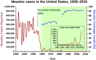 In several countries, reductions in the use of some vaccines were followed by increases in the diseases' morbidity and mortality.[161][162] According to the Centers for Disease Control and Prevention, continued high levels of vaccine coverage are necessary to prevent a resurgence of diseases that have been nearly eliminated.[163] Pertussis remains a major health problem in developing countries, where mass vaccination is not practiced; the World Health Organization estimates it caused 294,000 deaths in 2002.[164] Vaccine hesitancy has contributed to the resurgence of preventable disease. For example, in 2019, the number of measles cases increased by thirty percent worldwide and many cases occurred in countries that had nearly eliminated measles.[28]