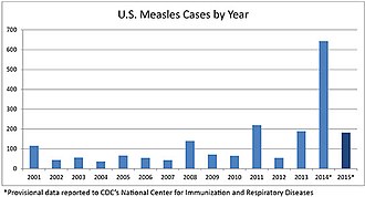 The number of cases in 2014 quadrupled to 644,[177] including transmission by unvaccinated visitors to Disneyland in California, during the Disneyland measles outbreak.[73][178] Some 97% of cases in the first half of the year were confirmed to be due directly or indirectly to importation (the remainder were unknown), and 49% from the Philippines. More than half the victims (165 out of 288, or 57%) during that time were confirmed to be unvaccinated by choice; 30 (10%) were confirmed to have been vaccinated.[179] The final count of measles in 2014 was 668 cases in 27 states.[180]