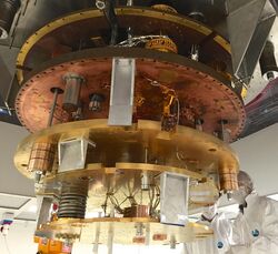 Using the results of Cuoricino, the final details of the CUORE detector towers were finalized, and an assembly sequence was set up for the construction of these 19 towers.[13] CUORE-0 was the first detector tower produced on this assembly line. It had 52 improved TeO2 crystals in a copper tower with better surface purity and significantly reduced radon and other contamination.[14] It was operated in the Cuoricino cryostat from 2013 to 2015 as a first test of the new CUORE assembly procedures as the assembly of the CUORE towers was completed.[15]