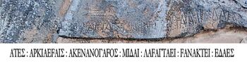 Ancient authors like Herodotus and Hesychius have provided us with a few dozen words assumed to be Phrygian, so-called glosses.[13] In modern times the first monument with a Phrygian text, found at Ortaköy (classical Orcistus), was described in 1752.[14] In 1800 at Yazılıkaya (classical Nakoleia) two more inscriptions were discovered.[15][16] On one of them the word ΜΙΔΑΙ (Midai), 'to Midas', could be read, which prompted the idea that they were part of a building, possibly the grave, of the legendary Phrygian king Midas. Later, when Western archeologists, historians and other scholars began to travel through Anatolia to become acquainted with the geographical background of Homer's world and the New Testament, more monuments were discovered. By 1862 sixteen Phrygian inscriptions were known, among them a few Greek-Phrygian bilinguals. This allowed German scholar Andreas David Mordtmann to undertake the first serious attempt to decipher the script, though he overstressed the parallels of Phrygian to Armenian, which led to some false conclusions.[17] After 1880, the Scottish Bible scholar William Mitchell Ramsay discovered many more inscriptions. In the 20th century, the understanding of Phrygian has increased, due to a steady flow of new texts, more reliable transcriptions, and better knowledge of the Indo-European sound change laws. The alphabet is now well-known, though minor revisions of the rarer signs of the alphabet are still possible, one sign (