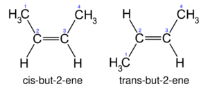 If the double bond of an acyclic mono-ene is not the first bond of the chain, the name as constructed above still does not completely identify the compound, because of cis–trans isomerism. Then one must specify whether the two single C–C bonds adjacent to the double bond are on the same side of its plane, or on opposite sides. For monoalkenes, the configuration is often indicated by the prefixes cis- (from Latin "on this side of") or trans- ("across", "on the other side of") before the name, respectively; as in cis-2-pentene or trans-2-butene.