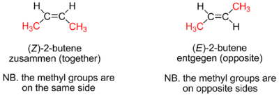 More generally, cis–trans isomerism will exist if each of the two carbons of in the double bond has two different atoms or groups attached to it. Accounting for these cases, the IUPAC recommends the more general E–Z notation, instead of the cis and trans prefixes. This notation considers the group with highest CIP priority in each of the two carbons. If these two groups are on opposite sides of the double bond's plane, the configuration is labeled E (from the German entgegen meaning "opposite"); if they are on the same side, it is labeled Z (from German zusammen, "together"). This labeling may be taught with mnemonic "Z means 'on ze zame zide'".[33]