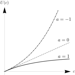 [math]\displaystyle{ c }[/math] is a variable that the economic decision-maker prefers more of, such as consumption, and [math]\displaystyle{ a }[/math] is a constant that represents the degree of risk preference ([math]\displaystyle{ a\gt 0 }[/math] for risk aversion, [math]\displaystyle{ a=0 }[/math] for risk-neutrality, or [math]\displaystyle{ a\lt 0 }[/math] for risk-seeking). In situations where only risk aversion is allowed, the formula is often simplified to [math]\displaystyle{ u(c)=1-e^{-a c} }[/math].