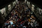US Marines with SP-MAGTF-CR-CC at an evacuation checkpoint at Kabul Airport on 21 August during the 2021 Fall of Kabul, at the end of the War in Afghanistan.