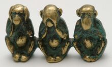 From Handwiki The three wise monkeys are a pictorial maxim, embodying the proverbial principle "see no evil, hear no evil, speak no evil".[1] The three monkeys are Mizaru, covering his eyes, who sees no evil; Kikazaru, covering his ears, who hears no evil; and Iwazaru, covering his mouth, who speaks no evil.[2] Lafcadio Hearn refers to them as the three mystic apes in his Glimpses of unfamiliar Japan (volume 2, page 127).