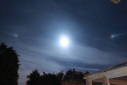 A member of the halo family, moon dogs are caused by the refraction of moonlight by hexagonal-plate-shaped ice crystals in cirrus or cirrostratus clouds. They typically appear as a pair of faint patches of light, at around 22° to the left and right of the Moon, and at the same altitude above the horizon as the Moon. They may also appear alongside 22° halos.[2]