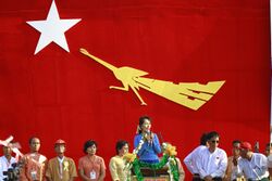 Aung San Suu Kyi, whose party had won the November 2020 Myanmar general election, was arrested on 1 February 2021 following a coup d'état that returned the Tatmadaw (Myanmar Armed Forces) to power and sparked protests across the country. Several charges were filed against her, and on 6 December 2021, she was sentenced to four years in prison on two of them. Later, on 10 January 2022, she was sentenced to an additional four years on another set of charges.[16] On 12 October 2022, she was convicted of two further charges of corruption and she was sentenced to two terms of three years' imprisonment to be served concurrent to each other.[17] On 30 December 2022, her trials ended with another conviction and an additional sentence of seven years' imprisonment for corruption. Aung San Suu Kyi's final sentence was of 33 years in prison,[18] later reduced to 27 years.[19] The United Nations, most European countries, and the United States condemned the arrests, trials, and sentences as politically motivated.[20]