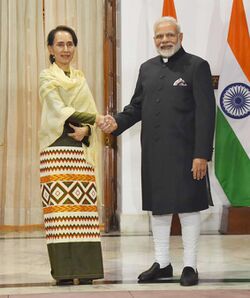 When she ascended to the office of state counsellor, Aung San Suu Kyi drew criticism from several countries, organisations and figures over Myanmar's inaction in response to the genocide of the Rohingya people in Rakhine State and refusal to acknowledge that Myanmar's military has committed massacres.[10][11][12][13] Under her leadership, Myanmar also drew criticism for prosecutions of journalists.[14] In 2019, Aung San Suu Kyi appeared in the International Court of Justice where she defended the Burmese military against allegations of genocide against the Rohingya.[15]