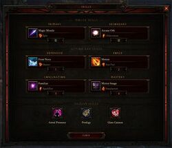 Skill runes, another new feature, are skill modifiers that are unlocked as the player levels up. Unlike the socketable runes in Diablo II, skill runes are not items but instead provide options for enhancing skills, often completely changing the gameplay of each skill.[11] For example, one skill rune for the Wizard's meteor ability reduces its arcane power cost, while another turns the meteor to ice, causing cold damage rather than fire.