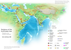 The regional ports of Barbaricum (modern Karachi), Sounagoura (central Bangladesh) Barygaza, Muziris in Kerala, Korkai, Kaveripattinam and Arikamedu on the southern tip of present-day India were the main centers of this trade, along with Kodumanal, an inland city. The Periplus Maris Erythraei describes Greco-Roman merchants selling in Barbaricum "thin clothing, figured linens, topaz, coral, storax, frankincense, vessels of glass, silver and gold plate, and a little wine" in exchange for "costus, bdellium, lycium, nard, turquoise, lapis lazuli, Seric skins, cotton cloth, silk yarn, and indigo".[22] In Barygaza, they would buy wheat, rice, sesame oil, cotton and cloth.[22]