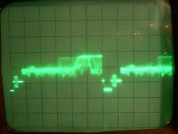 PAL video signal scan line. From the left: horizontal sync pulse, back porch with color burst, signal itself, front porch, sync pulse, back porch with color burst, video portion of the next scan line. The signals from multiple lines are overlaid, showing shaded areas instead of a single curve