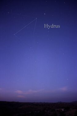Irregular in shape,[7] Hydrus is bordered by Mensa to the southeast, Eridanus to the east, Horologium and Reticulum to the northeast, Phoenix to the north, Tucana to the northwest and west, and Octans to the south; Lacaille had shortened Hydrus' tail to make space for this last constellation he had drawn up.[5] Covering 243 square degrees and 0.589% of the night sky, it ranks 61st of the 88 constellations in size.[8] The three-letter abbreviation for the constellation, as adopted by the International Astronomical Union in 1922, is "Hyi".[9] The official constellation boundaries, as set by Belgian astronomer Eugène Delporte in 1930, are defined by a polygon of 12 segments. In the equatorial coordinate system, the right ascension coordinates of these borders lie between 00h 06.1m and 04h 35.1m, while the declination coordinates are between −57.85° and −82.06°.[1] As one of the deep southern constellations, it remains below the horizon at latitudes north of the 30th parallel in the Northern Hemisphere, and is circumpolar at latitudes south of the 50th parallel in the Southern Hemisphere.[7] Herman Melville mentions it and Argo Navis in Moby Dick "beneath effulgent Antarctic Skies", highlighting his knowledge of the southern constellations from whaling voyages.[10] A line drawn between the long axis of the Southern Cross to Beta Hydri and then extended 4.5 times will mark a point due south.[11] Hydrus culminates at midnight around 26 October.[12]