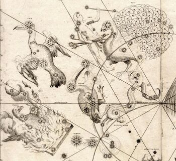 Keyzer and de Houtman assigned fifteen stars to the constellation in their Malay and Madagascan vocabulary, with a star that would be later designated as Alpha Hydri marking the head, Gamma the chest and a number of stars that were later allocated to Tucana, Reticulum, Mensa and Horologium marking the body and tail.[13] Lacaille charted and designated 20 stars with the Bayer designations Alpha through to Tau in 1756. Of these, he used the designations Eta, Pi and Tau twice each, for three sets of two stars close together, and omitted Omicron and Xi. He assigned Rho to a star that subsequent astronomers were unable to find.[14]