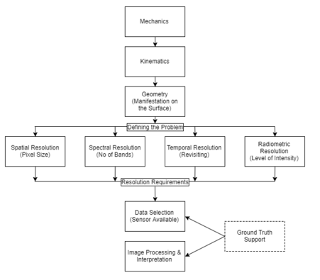 There is a trade-off between spatial resolution and spectral resolution.[7] Since the intensity of incident ray is fixed, for a higher spectral resolution, it is expected to have a lower spatial resolution (one pixel represent larger area) to maintain an up-to-standard signal-to-noise ratio for analysis.[7] Also, the data volume for transmission is limited due to signal engineering problem.[7] One can never obtain data with maximum resolutions in all spatial, spectral and radiometric resolutions due to these constraints. The temporal resolution could be understood as both the revisiting frequency and the deformation duration.[3] For instance an instantaneous landslide or sinkhole collapse could hardly be recorded without high speed camera, while relics could be imaged into time-series where the temporal change, for instance ice calving could be revealed.