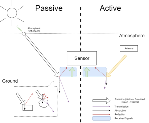 In remote sensing, the electromagnetic radiation acts as the information carrier, with a distance of tens to thousands of kilometers distance between the sensor and the target.[3] Proximal Sensing is a similar idea but often refer to laboratory and field measurements, instead of images showing a large spatial extent.[5] Geophysical methods, for instance Sonar and acoustic methods, shares similar properties with remote sensing but electromagnetic wave is not the sole medium.[6] Geotechnical instrumentations, for example piezometer, tiltmeter and Global Positioning System (GPS), on the other hand, often refer to instruments installed to measure discrete point data, compared to imagery in remote sensing.[6] A suitable sensor sensitive to the particular wavelength region, according to the designated use, is selected and employed to collect the electromagnetic wave reflected or emitted from the target object.[3]