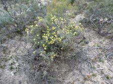 Melaleuca pungens grows to about 0.5–1.0 m (2–3 ft) high and wide. The leaves are nearly linear, 10–35 mm (0.4–1 in) long and about 1 mm (0.04 in) wide, lack a stalk, spread in all directions and have a small, sharp point on the end making the plant exceptionally prickly. New growth is silky. The bright yellow flowers appear in September and October, are numerous and in rounded or elongated heads about 15 millimetres (0.6 in) wide. The leaves and flower stalks are covered with fine, soft hairs. The fruit are fused together in clusters, 3–4 mm (0.1–0.2 in) wide.[2][3]