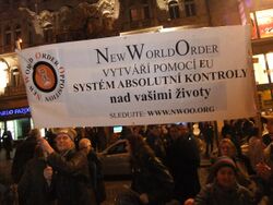 The New World Order (NWO) is a term used in several conspiracy theories which hypothesize a secretly emerging totalitarian world government.[3][4][5][6][7] The common theme in conspiracy theories about a New World Order is that a secretive power elite with a globalist agenda is conspiring to eventually achieve world domination and rule the world through an authoritarian one-world government—which will replace sovereign nation-states—and an all-encompassing propaganda whose ideology hails the establishment of the New World Order as the culmination of history's progress. Many influential historical and contemporary figures have therefore been alleged to be part of a cabal that operates through many front organizations to orchestrate significant political and financial events, ranging from causing systemic crises to pushing through controversial policies, at both national and international levels, as steps in an ongoing plot to achieve world domination.[3][4][5][6][7]
