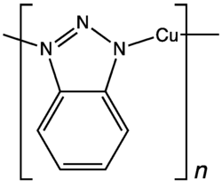 Benzotriazole inhibits corrosion of copper by forming an inert layer of this polymer on the metal's surface