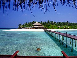 The Maldives is the lowest country in the world, with maximum and average natural ground levels of only 2.4 metres (7 ft 10 in) and 1.5 metres (4 ft 11 in) above sea level, respectively. In areas where construction exists, however, this has been increased to several metres. More than 80 per cent of the country's land is composed of coral islands which rise less than one metre above sea level.[76] As a result, the Maldives are in danger of being submerged due to rising sea levels. The Intergovernmental Panel on Climate Change has warned that, at current rates, sea-level rise would be high enough to make the Maldives uninhabitable by 2100.[77][78]