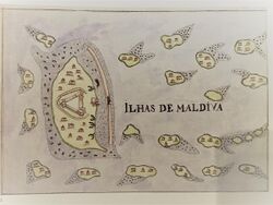 Medieval Arab travellers such as Ibn Battuta called the islands Script error: The function "transl" does not exist. (محل ديبية) from the Arabic word Script error: The function "transl" does not exist. ("palace"), which must be how the Berber traveller interpreted the local name, having been through Muslim North India, where Perso-Arabic words were introduced to the local vocabulary.[28] This is the name currently inscribed on the scroll in the Maldives state emblem.[29] The classical Persian/Arabic name for the Maldives is Dibajat.[30][31] The Dutch referred to the islands as the Maldivische Eilanden (nl),[32] while the British anglicised the local name for the islands first to the "Maldive Islands" and later to "Maldives".[32]