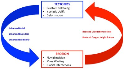 While tectonic uplift in any case will lead to some form of increased elevation, thus higher rates of erosion, a primary focus is set on isostatic uplift as it provides a fundamental connection between the causes and effects of erosional-tectonic interactions.