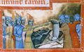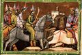 Mongols chase Hungarian king from Mohi, detail from Chronicon Pictum.