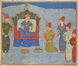 Berke left no sons, so Batu's grandson Mengu-Timur was nominated by Kublai and succeeded his uncle Berke.[43] However, Mengu-Timur secretly supported the Ögedeid prince Kaidu against Kublai and the Ilkhanate. After the defeat of Ghiyas-ud-din Baraq, a peace treaty was concluded in 1267 granting one-third of Transoxiana to Kaidu and Mengu-Timur.[44] In 1268, when a group of princes operating in Central Asia on Kublai's behalf mutinied and arrested two sons of the Qaghan (Great Khan), they sent them to Mengu-Timur. One of them, Nomoghan, favorite of Kublai, was located in the Crimea.[45] Mengu-Timur might have briefly struggled with Hulagu's successor Abagha, but the Great Khan Kublai forced them to sign a peace treaty.[46] He was allowed to take his share in Persia. Independently from the Khan, Nogai expressed his desire to ally with Baibars in 1271. Despite the fact that he was proposing a joint attack on the Ilkhanate with the Mamluks of Egypt, Mengu-Timur congratulated Abagha when Baraq was defeated by the Ilkhan in 1270.[47]