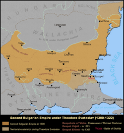 In the 1270s, Nogai had raided Bulgaria,[62] as well as Lithuania.[63] He blockaded Michael Asen II inside Drăstăr in 1279, executed the rebel emperor Ivailo in 1280, and forced George Terter I to seek refuge in the Byzantine Empire in 1292. In 1284, Saqchi came under the Mongol rule during the major invasion of Bulgaria, and coins were struck in the Khan's name.[64] Smilets was installed by Nogai as emperor of Bulgaria. Accordingly, the reign of Smilets has been considered the height of Mongol overlordship in Bulgaria. When he was expelled by a local boyars c. 1295, the Mongols launched another invasion to protect their protege. Nogai compelled Serbian king Stefan Milutin to accept Mongol supremacy and received his son, Stefan Dečanski, as hostage in 1287. Under his rule, the Vlachs, Slavs, Alans, and Turco-Mongols lived in modern-day Moldavia.