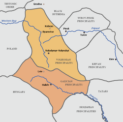 The Mongols had undermined the strength of Galicia and Volhynia, where the Danilovichi had sought to improve internal conditions in the country from the late 13th-century, with Yuri I assuming the royal title (rex Russiae) during his reign,[104] but the Lithuanian grand dukes managed to build a strong army and administration as well as uniting the Lithuanian and Belarusian provinces under their rule.[104] Following Yuri's death in 1308, the situation in Galicia and Volhynia quickly deteriorated, with both of his sons dying in 1323, leading to the throne to be offered to Boleslav of Mazovia.[105] He was confirmed by Öz Beg as "Yuri II".[105] Gediminas of Lithuania gained control of Kiev and installed his brother Fedor as prince, but the principality's tribute to the Khan continued. On a campaign a few years later, the Lithuanians under Fedor included the Khan's baskak in their entourage.[106] Yuri II married a daughter of Gediminas and possibly gave his daughter in marriage to a son of Gediminas, leading to Öz Beg to intervene to prevent the plans of Poland and Lithuania.[105] Mongol forces raided the borderlands of Lithuania in 1336 and then Lublin in Poland the next year.[105] The prince of Smolensk defied Öz Beg's authority, instead recognizing the suzerainty of Gediminas.[105] After the sudden death of Yuri II, who had no heirs, a committee of Galician boyars led by Dmytro Dedko took control of the city; a detachment of Mongol troops was sent to protect Galicia and Volhynia from the Poles, who were forced to retreat but did not give up on their claims to the region.[107]